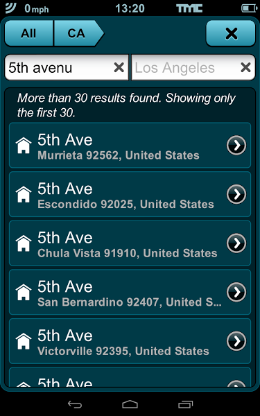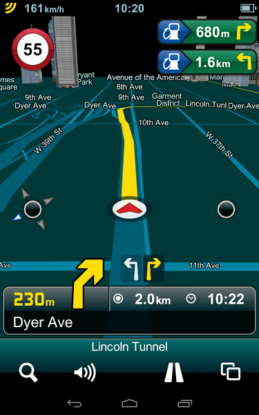 La app te permite introducir la dirección o seleccionar cualquiera de los muchos POIs que son extraídos de Foursquare. También es posible tratar directamente con las coordenadas del lugar en cuestión. El buscador es muy preciso, lo cual se agradece enormemente en un GPS. Ciertas estructuras son mostradas tridimensionalmente en el mapa que cambia en función de si conduces de día o de noche.